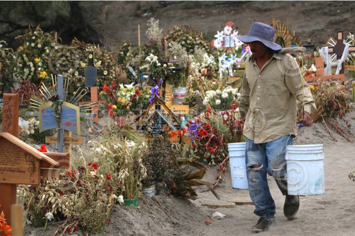 Un joven en compañía de su mascota carga una carretilla para adornar una lápida del panteón civil Xico del Valle de Chalco.