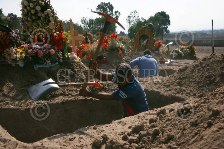 Alex, Genaro y José trabajan de sepultureros en el Panteón Municipal de Valle de Chalco, el cual ha tenido que ampliarse al terreno que antes era utilizado como estacionamiento por la demanda de entierros durante esta pandemia de Covid-19.
