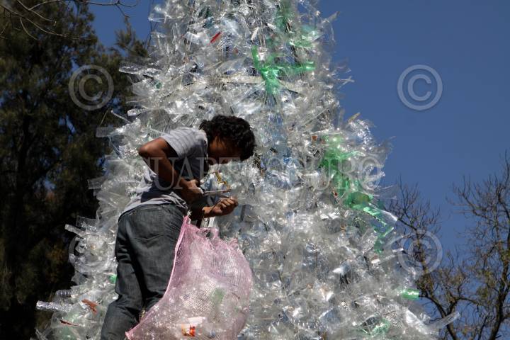 MÉXICO, D.F., 18DICIEMBRE2010.- Jóvenes terminan un árbol de navidad de 10 metros de altura el cual esta cubierto con botellas de PET, el cual contará con iluminación de leds y que a su vez estará conectado a una planta de luz que será alimentada con biodiesel, este árbol se encuentra en la explanada del Jardín Botánico del Bosque de Chapultepec. FOTO: RODOLFO ANGULO/CUARTOSCURO.COM