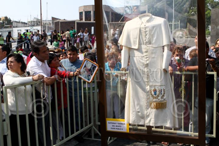 MÉXICO, D.F., 30ABRIL2011.- Cientos de fieles acuden a la Basílica de Guadalupe a la estatua del papa Juan Pablo II, en la cual fue inaugurada una Plazoleta y en la cual es exhibida una sotana y banda que uso el Papa en sus visitas anteriores, en este día que será beatificado en Roma, Italia. FOTO: RODOLFO ANGULO/CUARTOSCURO.COM