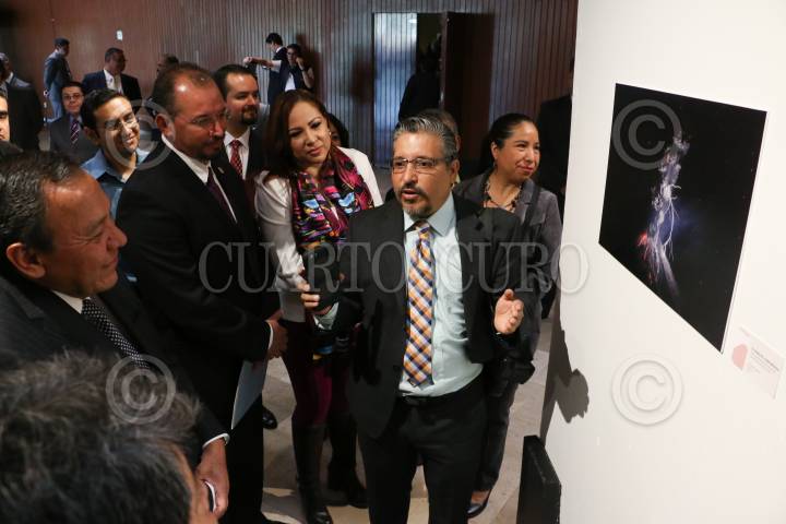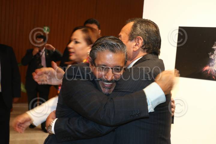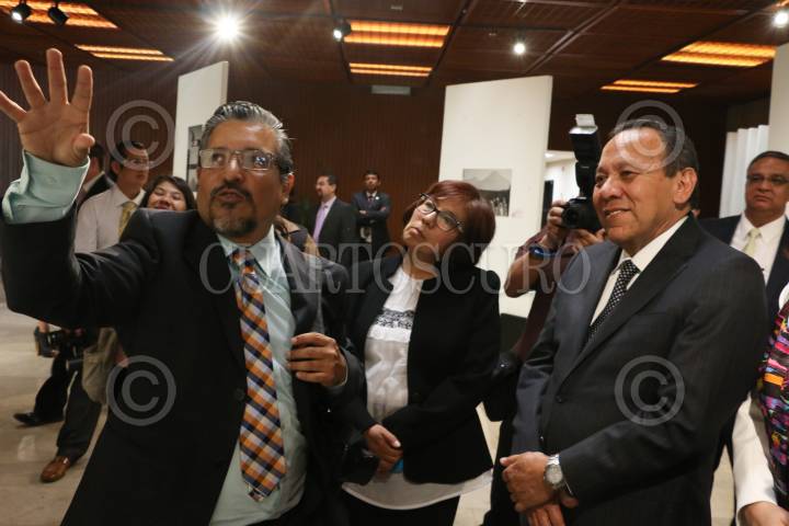 CIUDAD DE MÉXICO, 29MARZO2016.- Sergio Velasco Tapiro, fotoperiodista colimense y colaborador de Cuartoscuro quien obtuvo el tercer lugar en la categoría de “Naturaleza” del World Press Photo, acompañado de Jesús Zambrano, presidente de la Mesa Directiva de la Cámara de Diputados, durante la inauguración de la exposición "Colima Cuatro Elementos, Catorce Años Frente al Volcán" llevado acabo en el vestíbulo de la Cámara de Diputados. FOTO: SAÚL LÓPEZ /CUARTOSCURO.COM