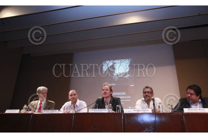 CIUDAD DE MÉXICO, 25AGOSTO2016.- Héctor Rivera Borrell, director del Museo Franz Mayer (MFM; Anuar Patjane, segundo lugar en la categoría de naturaleza del World Press Photo (WPP); Laurens Korteweg, comisario del WPP; Sergio Tapiro, tercer lugar del WWP en la categoría de tercer lugar, y Manuel Ríos de Macchina Tempo, durante la conferencia de prensa para hablar sobre la exposición de este certamen mundial en donde se muestra el trabajo de fotógrafos de diferentes latitudes y la cual se inaugura esta tarde en el MFM. FOTO: MOISÉS PABLO /CUARTOSCURO.COM