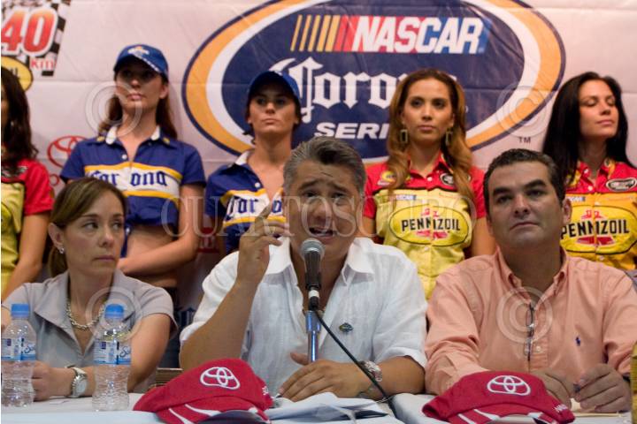 TUXTLA GUTIERREZ, CHIAPAS; 19MAYO2010.- Edgar Matute, Director Operativo de Nascar México, Karen Busto Directora de Mercadotecnia Pennzoil, Juan Carlos Cal Y Mayor Franco, Secretario de Turismo del Estado y Jorge Cuesi, Director del Deporte del Estado, acompañado de los pilotos del serial, en conferencia ante representantes de los medio de comunicación dieron a conocer los pormenores de la fecha cuatro del serial Nascar México en esta entidad que se correrá el próximo sábado por primera vez por la noche. FOTO: GUILLERMO PEREA/CUARTOSCURO.COM