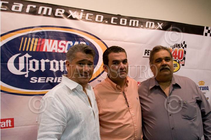 TUXTLA GUTIERREZ CHIAPAS, 19MAYO2010.-Edgar Matute Director Operativo de Nascar México, Karen Busto Directora de Mercadotecnia Pennzoil, Juan Carlos Cal Y Mayor Franco, Secretario de Turismo del Estado y Jorge Cuesi, Director del Deporte del Estado, acompañado de los pilotos del serial, en conferencia ante representantes de los medio de comunicación dieron a conocer los pormenores de la fecha cuatro del serial Nascar México en esta entidad que se correrá el próximo sábado por primera vez por la noche. FOTO: GUILLERMO PEREA/CUARTOSCURO.COM