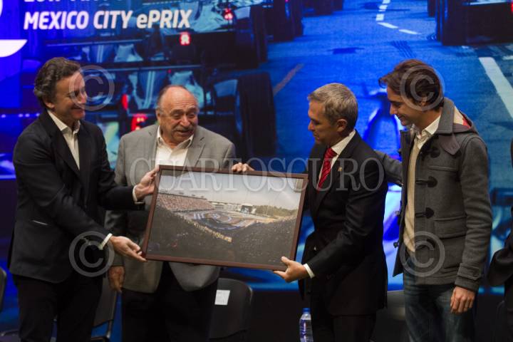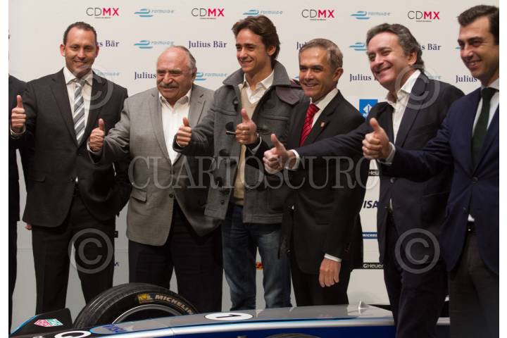 CIUDAD DE MÉXICO, 09ENERO2017.- Horacio de la Vega, director del Instituto del Deporte; José Abed, vicepresidente mundial de la Federación Internacional de Automovilismo; el piloto Estebán Gutiérrez; Miguel Ángel Mancera, Jefe de Gobierno, y Alejandro Agag, presidente de Fórmula E, durante la presentación del serial en el que participan carros totalmente eléctricos. FOTO: MOISÉS PABLO /CUARTOSCURO.COM