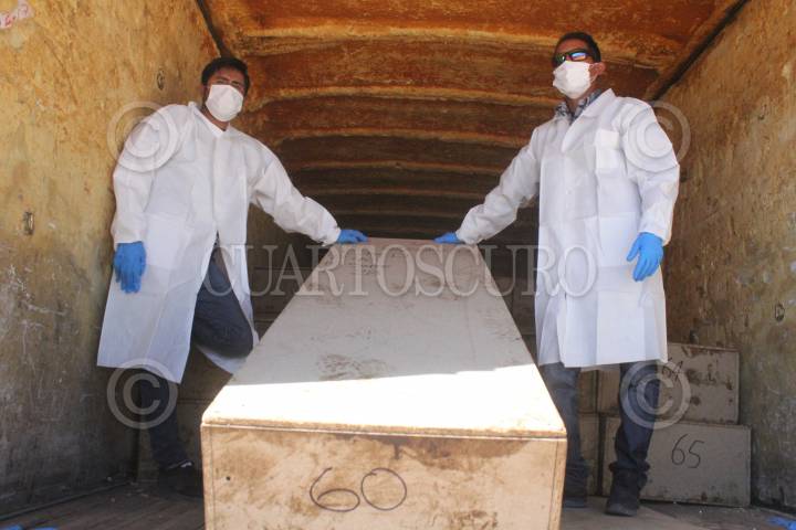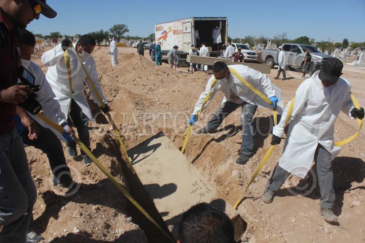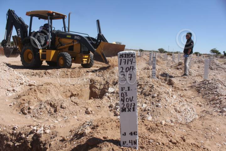 CIUDAD JUÁREZ, CHIHUAHUA, 10OCTUBRE2019.- Personal Servicios Periciales y Ciencias Forenses dio destino final a 157 cuerpos que permanecían bajo resguardo del Servicio Médico Forense. El personal practicó la necropsia de ley y los estudios correspondientes, sin embargo no fueron reclamados. De acuerdo con especialistas de servicios periciales zona norte, los trabajos se efectuarán durante tres días con el objetivo de llevar a cabo la inhumación de forma ordenada, con los controles y seguimiento necesarios. La Fiscalía informó que todos los cuerpos cuentan con análisis dactilares, odontológicos, antropométricos, perfil genético y fotografías por si existe una posterior reclamación de sus familiares o se abre la investigación. Se trata de 149 cuerpos pertenecientes al sexo masculinos y 8 del femenino. De ellos, 78 fallecieron por causas naturales, en hospitales, mientras que 77 corresponde a motivos dolosos y 2 por intoxicación por monóxido de carbono. FOTO: NACHO RUIZ /CUARTOSCURO.COM