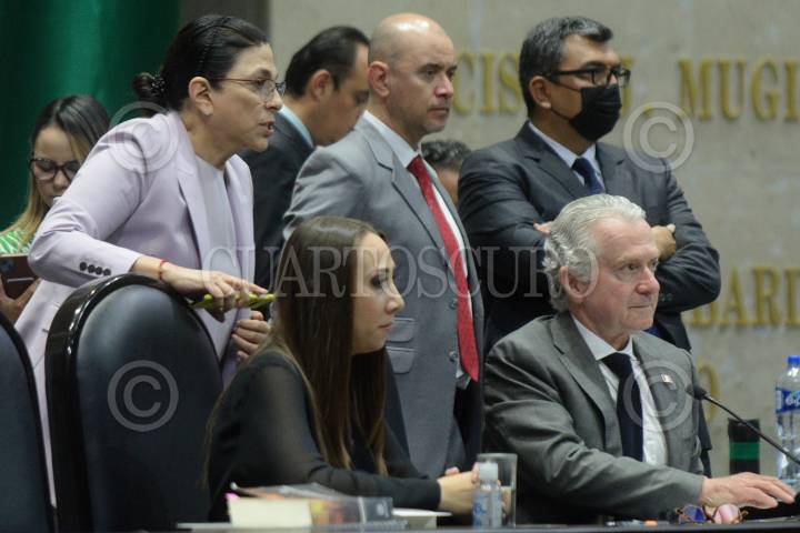 Santiago Creel, presidente de la mesa directiva, junto a las secretarias: Marcela Guerra Castillo y Karla Yuritzi Almazán, durante la sesión ordinaria de la Cámara de Diputados.