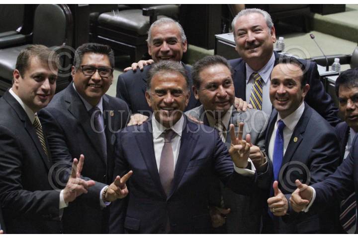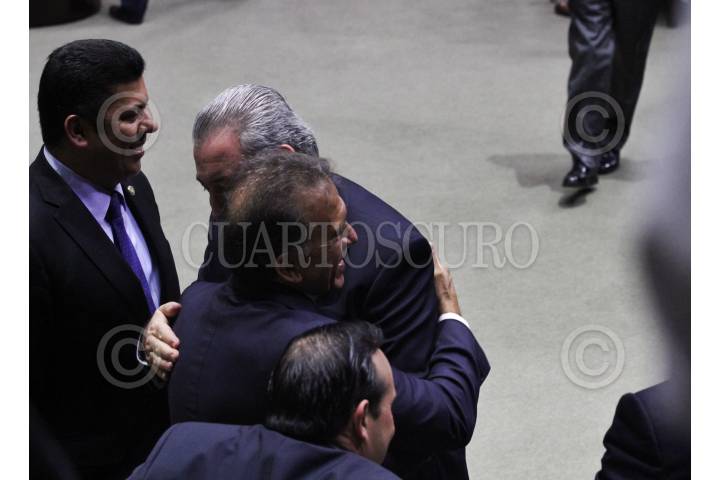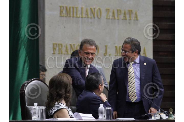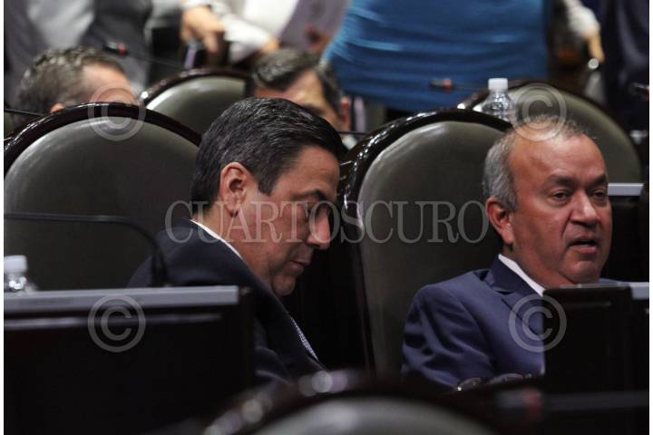 CIUDAD DE MÉXICO, 16JUNIO2016.- En la imagen, César Camacho abraza a Marko Cortés del PAN. Diputados continúan sesionando en la Cámara de Diputados en donde discuten en torno al Proyecto de a Decreto del Código Penal Federal en materia de Anticorrupción. FOTO: MARÍA JOSÉ MARTÍNEZ /CUARTOSCURO.COM