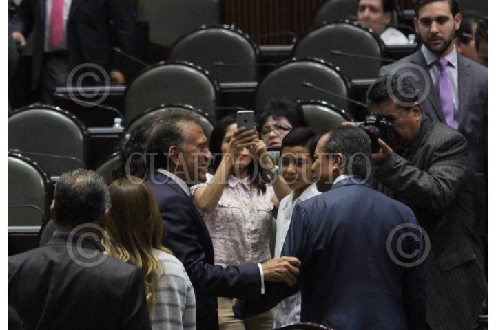 CIUDAD DE MÉXICO, 16JUNIO2016.- El candidato electo a gobernador de Veracruz, Miguel Ángel Yunes asistió al pleno en donde se detuvo saludar a la bancada bicolor; previamente fue convocado a conferencia en donde Marko Cortés, presidente de la bancada del PAN, a quien le entregó una constancia. FOTO: MARÍA JOSÉ MARTÍNEZ /CUARTOSCURO.COM
