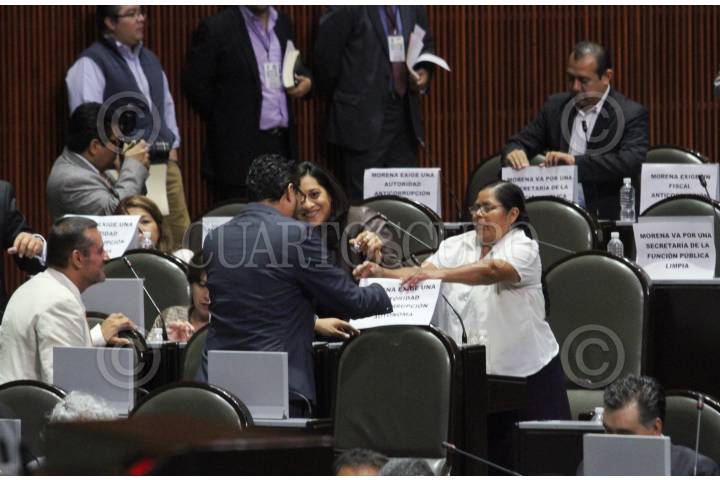 CIUDAD DE MÉXICO, 16JUNIO2016.- En la imagen, diputados de Morena pegan pancartas en los curules durante la sesión. Diputados continúan sesionando en la Cámara de Diputados en donde discuten en torno al Proyecto de a Decreto del Código Penal Federal en materia de Anticorrupción. FOTO: MARÍA JOSÉ MARTÍNEZ /CUARTOSCURO.COM