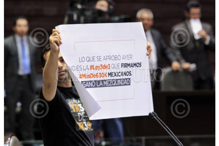 CIUDAD DE MÉXICO, 16JUNIO2016.- En la imagen, el diputado de MC, Jorge Álvarez saca una pancarta durante su participación. Diputados votaron a favor de la Ley 3 de 3 en lo general mientras continúan sesionando en la Cámara de Diputados en donde discuten en torno al Proyecto de a Decreto del Código Penal Federal en materia de Anticorrupción. FOTO: MARÍA JOSÉ MARTÍNEZ /CUARTOSCURO.COM