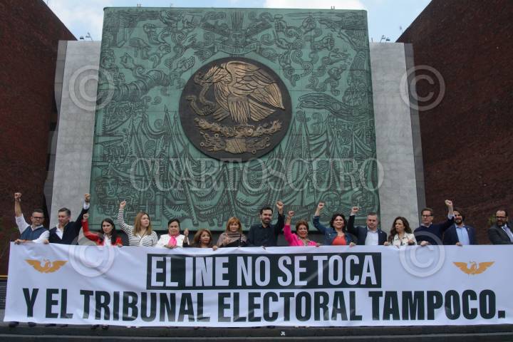 Diputados de Movimiento Ciudadano, muestran frente al frontispicio de la Cámara de Diputados, una manta en apoyo al INE y el TEPJF.