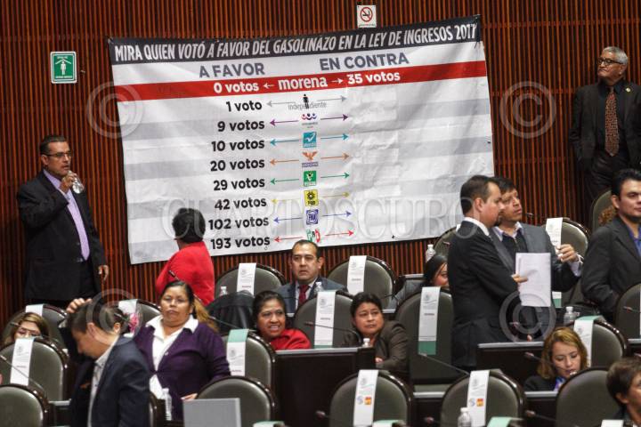 CIUDAD DE MÉXICO, 01FEBRERO2017.- Diputados de Morena mostraron una pancarta con la votación de la Ley de Ingresos 2017, durante la sesión solemne en San Lázaro por el centenario de la Constitución Mexicana. FOTO: ISAAC ESQUIVEL /CUARTOSCURO.COM