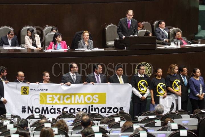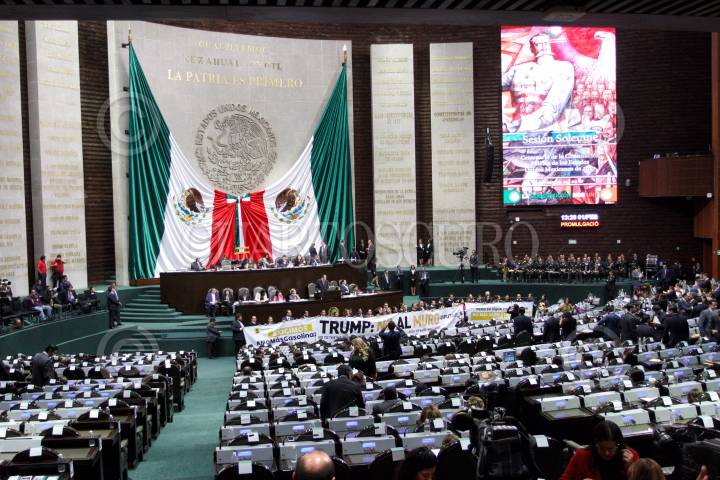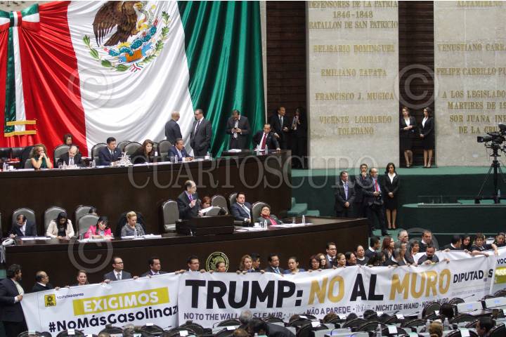 CIUDAD DE MÉXICO, 01FEBRERO2017.- Legisladores perredistas mostraron pancartas en contra del gazolinazo y el muro de Trump, durante el posicionamiento de Agustin Basave, en la sesión solemne en San Lázaro por el centenario de la Constitución Mexicana. FOTO: ISAAC ESQUIVEL /CUARTOSCURO.COM