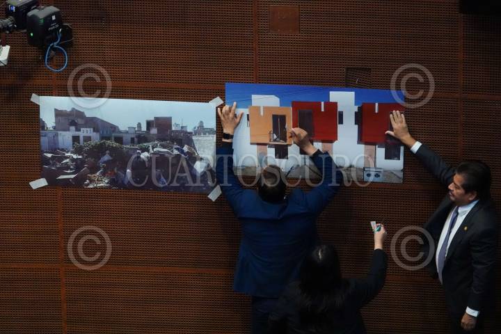 CIUDAD DE MÉXICO, 13FEBRERO2025.- Senadores morenistas colocan fotografías sobre las casas construidas por antiguas administraciones para los derechohabientes durante la sesión vespertina en al que se discute la aprobación de la Ley Infonavit ante el pleno del Senado del República. FOTO: GALO CAÑAS/CUARTOSCURO.COM