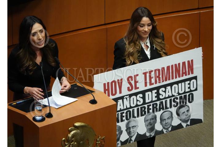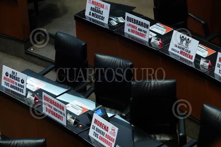 CIUDAD DE MÉXICO, 13FEBRERO2025.- La bancada de Movimiento Ciudadano colocó pancartas con las leyendas “Morena dejen de robarle a México” “Quebraron Pemex, van por el Infonavit” e “Infonavit la nueva caja chica de Morena”, por mencionar algunas, durante la sesión vespertina en al que se discute la aprobación de la Ley Infonavit ante el pleno del Senado del República. FOTO: GALO CAÑAS/CUARTOSCURO.COM