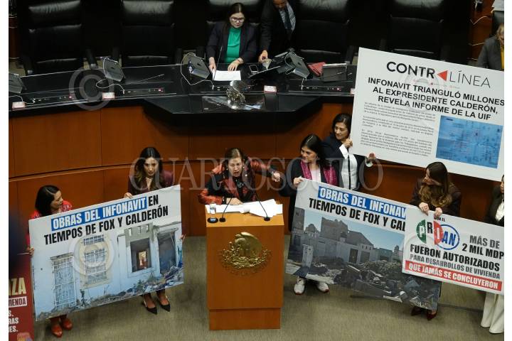 CIUDAD DE MÉXICO, 13FEBRERO2025.- La senadora morenista Blanca Judith Díaz hace uso de la tribuna mientras legisladoras sostienen pancartas señalando las irregularidades de administraciones anteriores durante la sesión vespertina en al que se discute la aprobación de la Ley Infonavit ante el pleno del Senado del República. FOTO: GALO CAÑAS/CUARTOSCURO.COM