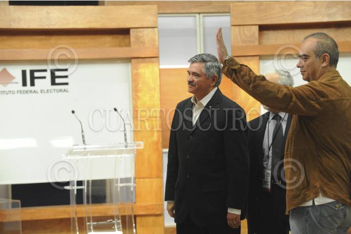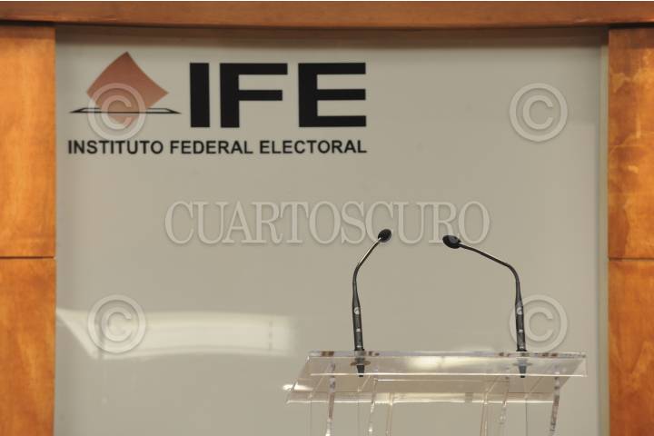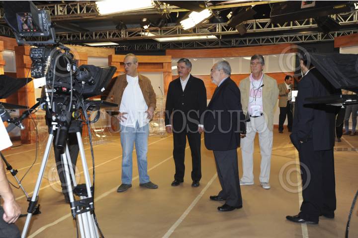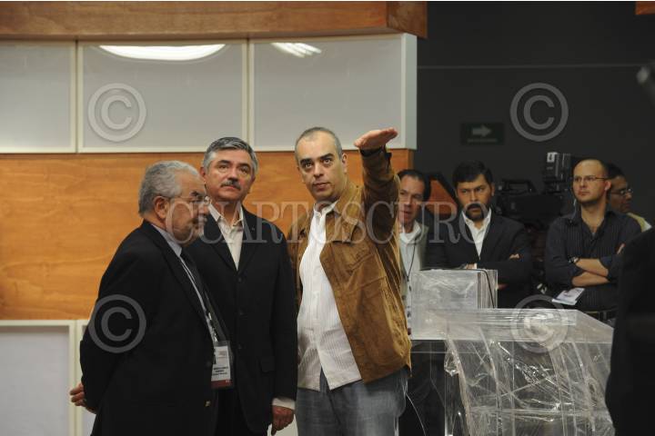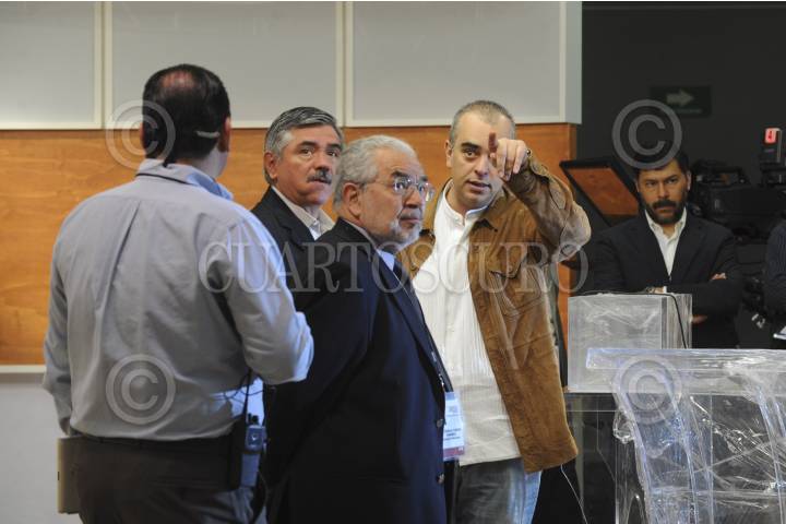 MÉXICO, D.F., 05MAYO2012.- Los consejeros Leonardo Valdés Zurita, presidente y Alfredo Figueroa Fernández, encabezaron un recorrido por el estudio televisivo montando especialmente para el debate entre los candidatos presidenciales 2012 el día de mañana, que se realizará en el WTC. FOTO: MOISÉS PABLO /CUARTOSCURO.COM
