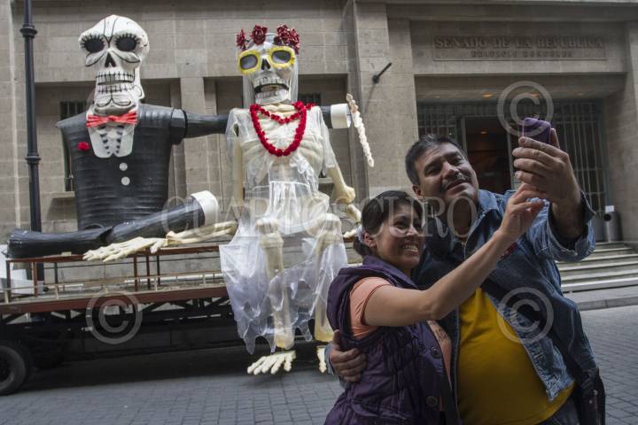 MÉXICO, D.F., 16MARZO2015.- Una pareja se toma una fotografía frente a dos calaveras que son parte de los preparativos para el set de filmación de la película James Bond. FOTO: ISAAC ESQUIVEL /CUARTOSCURO.COM