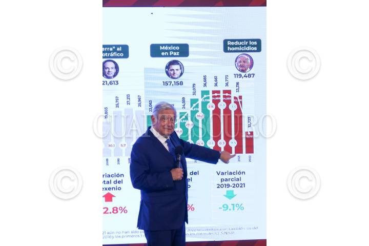 Andrés Manuel López Obrador, Presidente de México, muestra una lámina con el número de homicidios por sexenio asegurando que en el suyo van a la baja un 9% en comparación al mandato de Enrique Peña Nieto.
