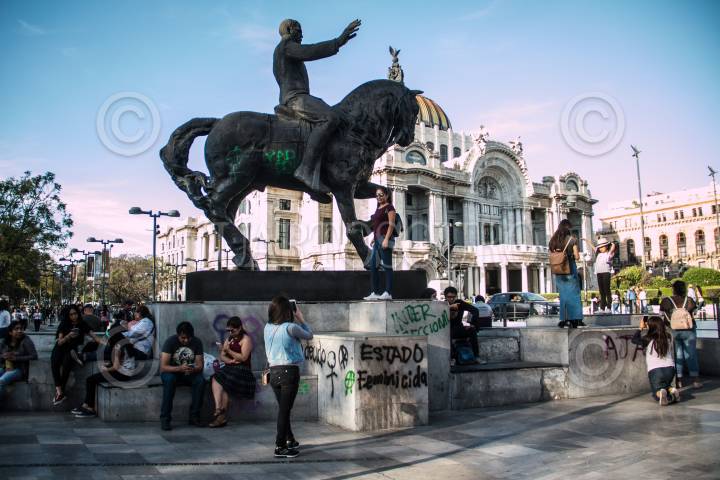 CIUDAD DE MÉXICO, 13ABRIL2019.- El Monumento a Madero, obra del artista Javier Marín, y que forma parte del paisaje entre la explanada del Palacio de Bellas Artes y la Alameda Central, continúa con las intervenciones que mujeres realizaron el pasado 8 de marzo en protesta por la apatía de las autoridades ante los feminicidios del país. FOTO: ANDREA MURCIA /CUARTOSCURO.COM
