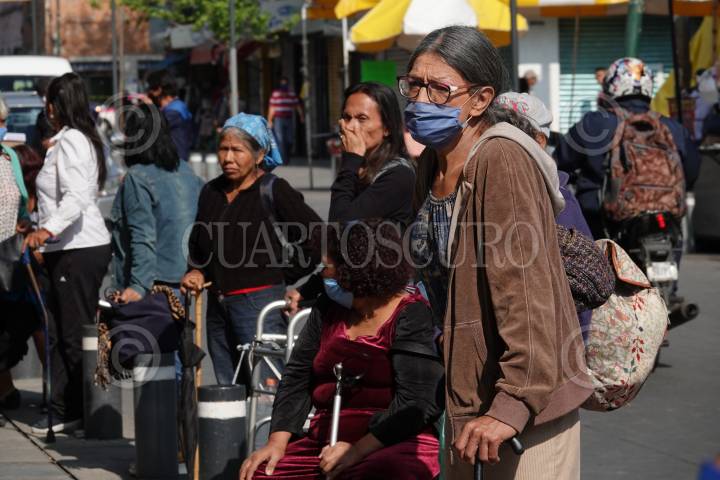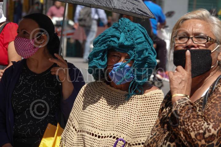 Mujeres de la tercera edad esperan bajo los intensos rayos del sol por una despensa de ayuda que entregó la Brigada Callejera de Apoyo a la Mujer Elisa Martínez