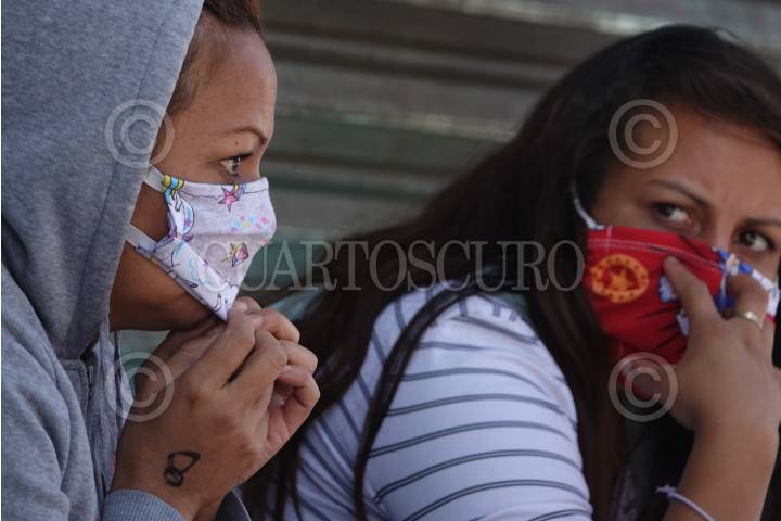 Mujeres con cubrebocas y capuchas esperan varias horas para recibir una despensa por parte de la Brigada Callejera "Elisa Martínez"