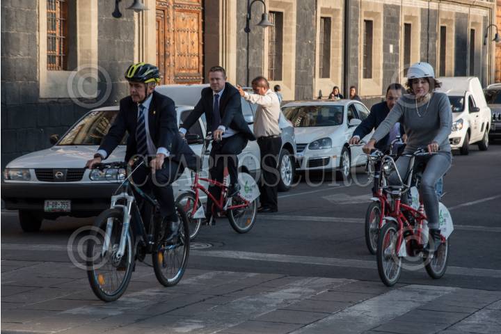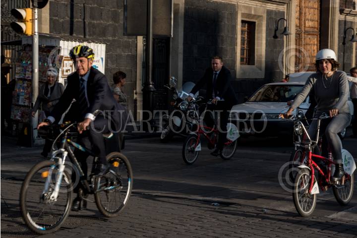 CIUDAD DE MÉXICO, 19ABRIL2017.- Miguel Ángel Mancera Espinosa, jefe de gobierno y Tania Muller, secretaria de medio ambiente, llegaron en bicicleta a la inauguración del Sexto Foro Mundial de la Bicicleta. FOTO: TERCERO DÍAZ /CUARTOSCURO.COM