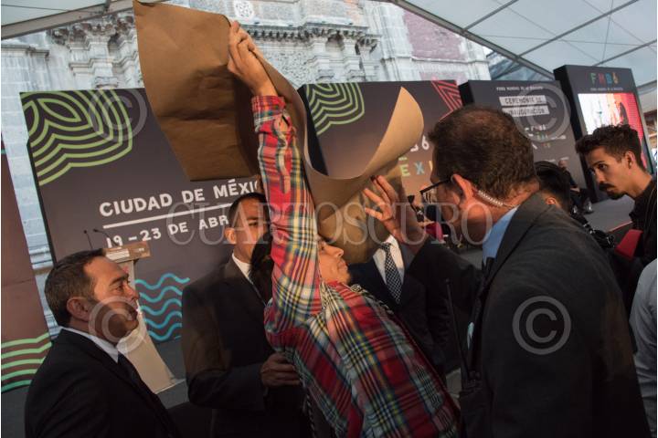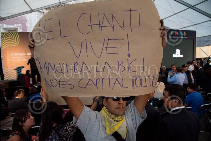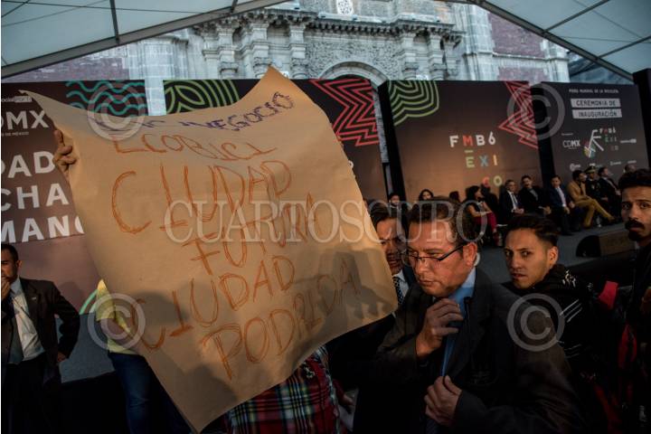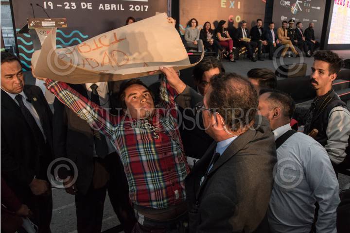 CIUDAD DE MÉXICO, 19ABRIL2017.- Durante la inauguración del Sexto Foro Mundial de la Bicicleta, en la que estuvo presente Miguel Ángel Mancera Espinosa, jefe de gobierno dela CDMX, manifestantes se presentaron con pancartas que decían “Bici Negocio EcoBici Ciudad Futura Ciudad Podrida” y “El Chanti Vive, Mancera la bici no es capital político”. Durante algunos minutos guardias de seguridad del jefe de gobierno intentaron retirar a los manifestantes pero se contuvieron de usar la fuerza por el apoyo de algunos asistentes. FOTO: TERCERO DÍAZ /CUARTOSCURO.COM