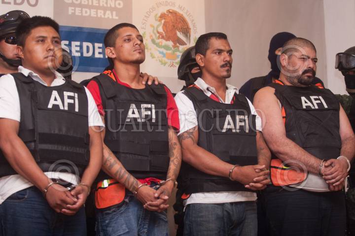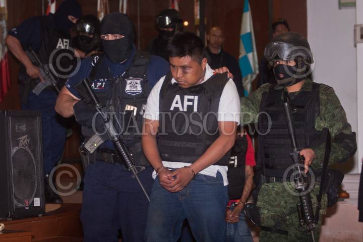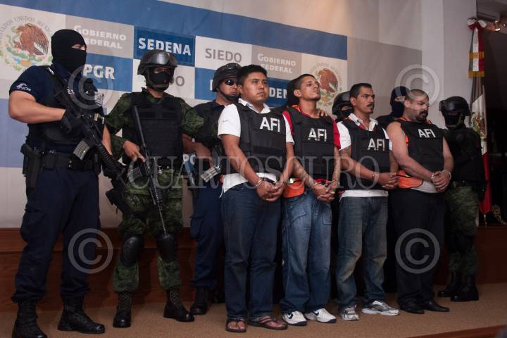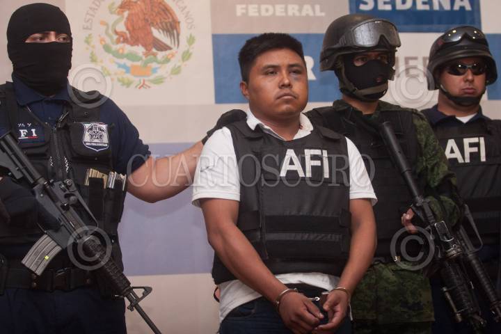 MÉXICO, D.F., 30JUNIO2011.- Abraham BArrios Caporal, alias Erasmo, fue presentado en las instalaciones de la SIEDO, junto con Jhonny Enriquez Carmona "El Guiler", Luis Cabrera Velázquez "El Ronny" y Ramón Evangelista Martínez "El Cangrejo", quienes presuntamente son integrantes de la organización delictiva Los Zetas. Barrios Caporal es presunto autor material de las ejecuciones en San Fernando, Tamaulipas, ocurridas en agosto del año pasado. FOTO: ISAAC ESQUIVEL/CUARTOSCURO.COM