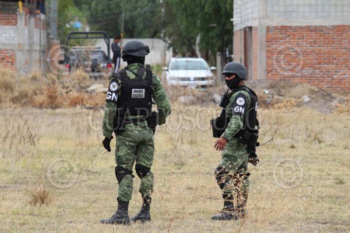 Elementos de la Guardia Nacional custodian el lugar donde cuatro hombres fueron emboscados en Apaseo El Grande.