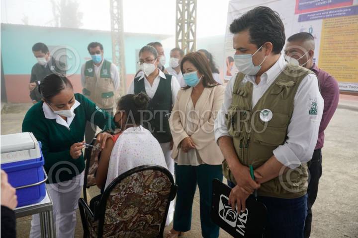 Zoé Robledo, titular del IMSS, observa la inmunización contra el Covid-19 en un habitante de la sierra madre de Chiapas.