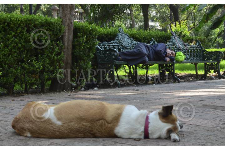 MÉXICO, D.F., 10SEPTIEMBRE2015.- Al unísono, un perro y un hombre dormitan en el Jardín de Santiago Tlatelolco, en la Unidad Habitacional Nonoalco-Tlatelolco. FOTO: MARÍA JOSÉ MARTÍNEZ /CUARTOSCURO.COM
