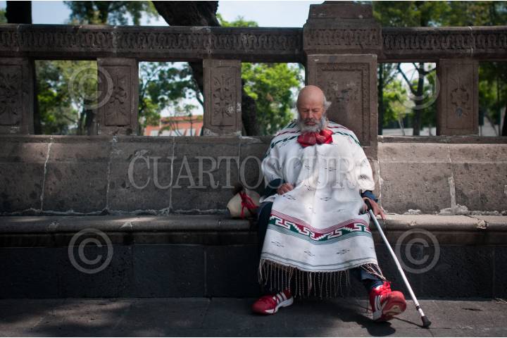 CIUDAD DE MÉXICO, 12JULIO2018.- Vestido con jorongo y un moño de mariachi, un señor de la tercera edad duerme en una banca de la Alameda Central durante una mañana nublada. FOTO: DIEGO SIMÓN SÁNCHEZ /CUARTOSCURO.COM