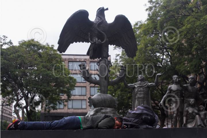 CIUDAD DE MÉXICO, 01OCTUBRE2018.- Un hombre duerme al pie de la escultura que narra la fundación del Imperio México-Tenóchtitlan, ubicado frente a la Suprema Corte de Justicia de la Nación. FOTO: MOISÉS PABLO /CUARTOSCURO.COM