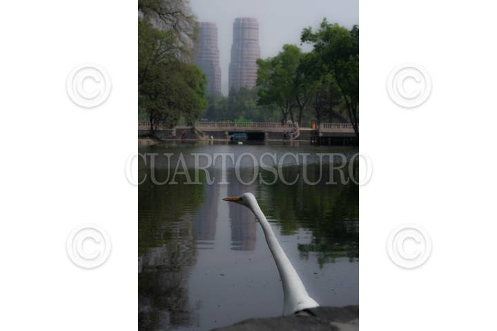 Un ganso busca alimento junto al lago de Chapultepec