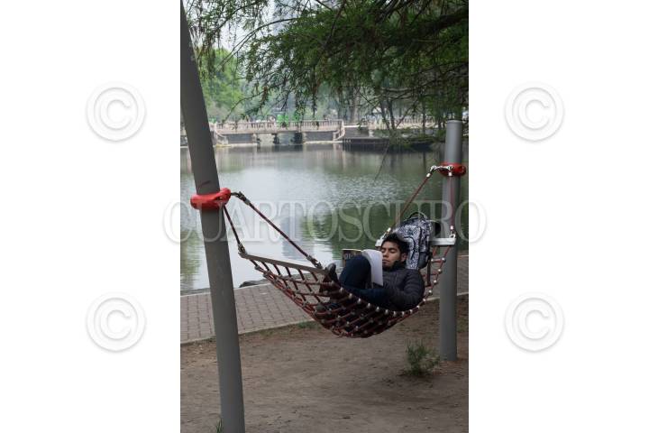 Un joven lee sobre un amaca