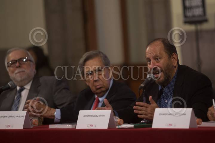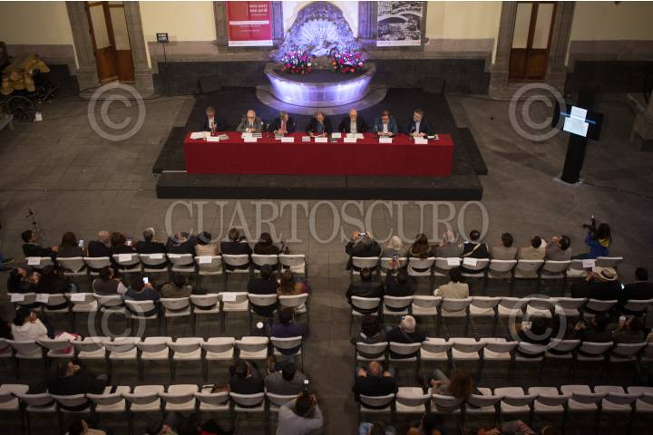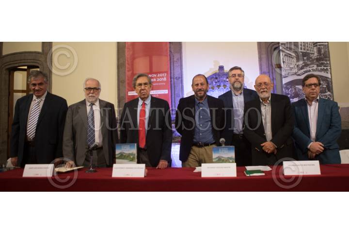 CIUDAD DE MÉXICO, 15MARZO2018.- Jóse María Espinasa, Javier Garciadiego, Cuauhtémoc Cárdenas, y Eduardo Vázquez, secretario de Cultura de la capital, Eduardo Matos, Ricardo Cayuela, y Alejandro Salafrancia, encabezaron la presentación del catalogo de la exposición "La Ciudad de México en el Arte. Travesía de ocho siglos". FOTO TERCERO DÍAZ /CUARTOSCURO.COM