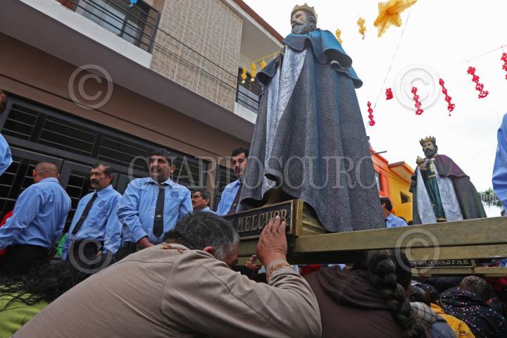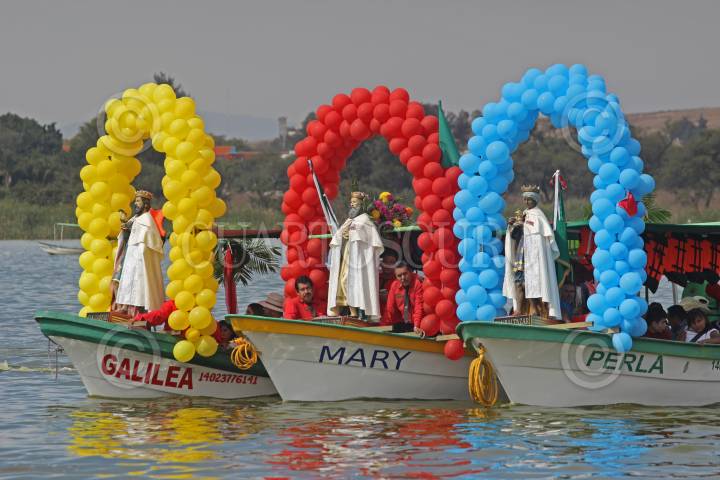 TLAJOMULCO DE ZUÑIGA, JALISCO, 07ENERO2016.- Como ya es tradición durante un poco mas de tres siglos en el poblado de Cajititlan, se llevo a cabo la celebración de los Santos Reyes Magos. Miles de feligreses participan en el recorrido de Melchor, Gaspar y Baltazar por los alrededores del pueblo, las personas se adelantan al paso de los Reyes para arrodillarse ante ellos y permitir que pasen por encima en un trayecto que dura más de tres horas. En su recorrido también hay un viaje en tres lanchas por la laguna de Cajititlan para llevarlos a bendecir el vaso lacustre. Las figuras bíblicas son acompañadas de música hasta su regreso al templo en donde se celebra una misa en su honor. FOTO: FERNANDO CARRANZA GARCÍA / CUARTOSCURO.COM
