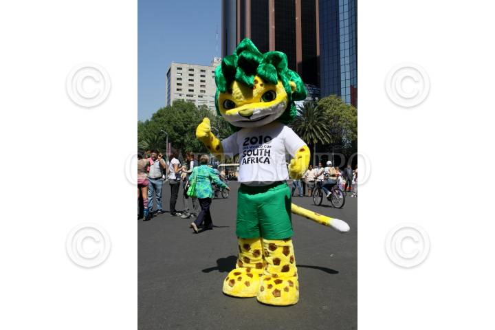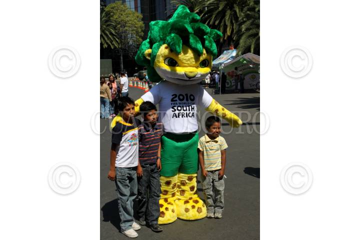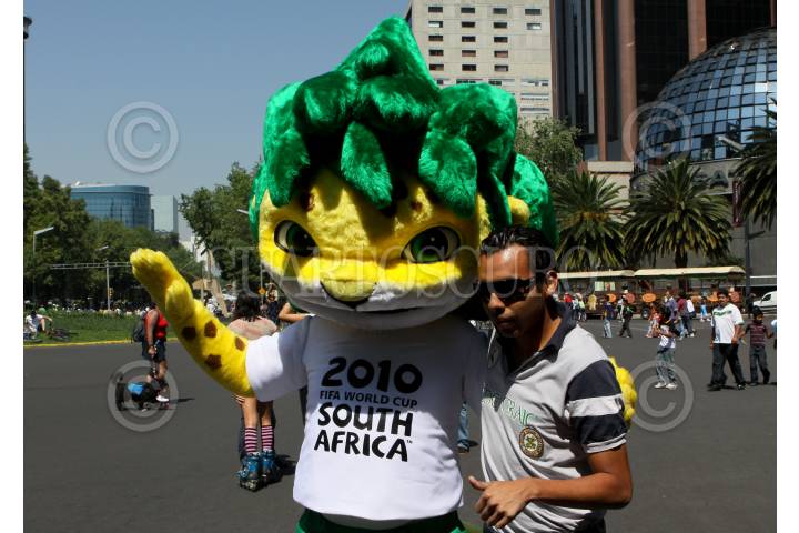 MÉXICO, D.F., 30MAYO2010.- Zakumi, la mascota oficial de la Copa Mundial de Fútbol Sudáfrica 2010 es un leopardo con pelo verde que es originario de Ciudad del Cabo, su nombre significa ZA, por las siglas de Sudáfrica y Kumi, significa 10 en varios idiomas africanos; dicha mascota estuvo presente en la glorieta de la Palma en donde niños y adultos se tomaron fotografías. FOTO: RODOLFO ANGULO/CUARTOSCURO.COM