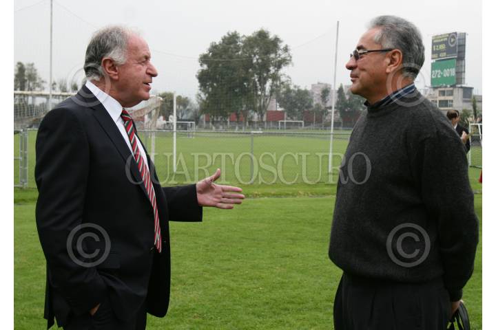 MÉXICO, D.F., 15ENERO2009.- Aarón Padilla, presidente de la Comisión de Arbitros de la Federación Mexicana de Futbol, conversa con Leonardo Cuellar, director de la Selección Nacional Femenil de futbol, durante la presentación de los nuevos uniformes de los árbitros de futbol. FOTO: ISAAC ESQUIVEL/CUARTOSCURO.COM
