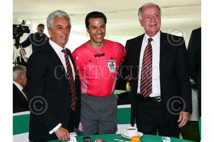 MÉXICO, D.F., 15ENERO2009.- El presidente de la FMF, Justino Compeán, el silbante Armando Archundia, y Aarón Padilla, presidente de la Comisión de Arbitros, durante la presentación de los nuevos uniformes que utilizarán los árbitros durante el torneo Apertura 2009. FOTO: ISAAC ESQUIVEL/CUARTOSCURO.COM