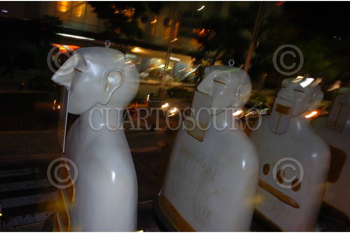 MÉXICO, D.F., 26OCTUBRE2011.- 10 esculturas monumentales de bronce, del artista mexicano Rivelino, fueron trasladadas en un recorrido por avenida Paseo de la Reforma hacia el Zócalo capitalino para su exhibición que empieza el 27 de octubre. La exposición "Nuestros Silencios" consta de 10 gigantes de bronce que pesan una tonelada; los colosos llegan al país después de recorrer 8 ciudades europeas. FOTO: IVAN MENDEZ/CUARTOSCURO.COM
