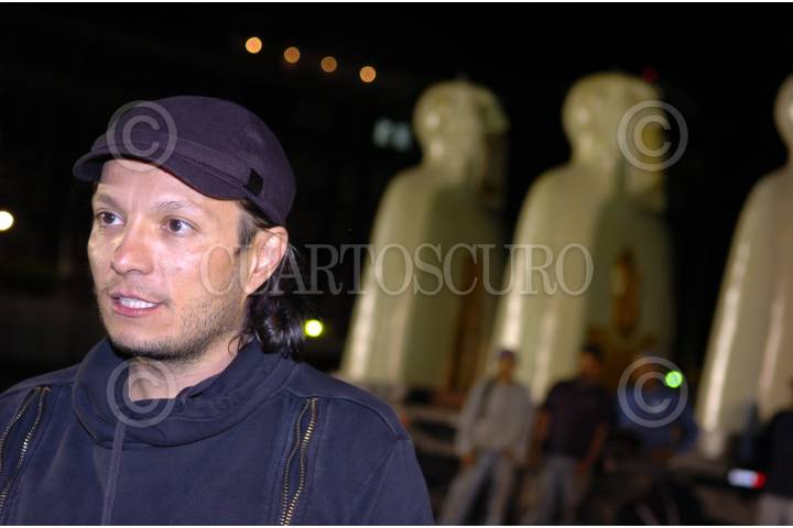 MÉXICO, D.F., 26OCTUBRE2011.- 10 esculturas monumentales de bronce, del artista mexicano Rivelino, fueron trasladadas en un recorrido por avenida Paseo de la Reforma hacia el Zócalo capitalino para su exhibición que empieza el 27 de octubre. La exposición "Nuestros Silencios" consta de 10 gigantes de bronce que pesan una tonelada; los colosos llegan al país despues de recorrer 8 ciudades europeas. En la imagen, el artista Rivelino durante el traslado de sus esculturas. FOTO: IVAN MENDEZ/CUARTOSCURO.COM