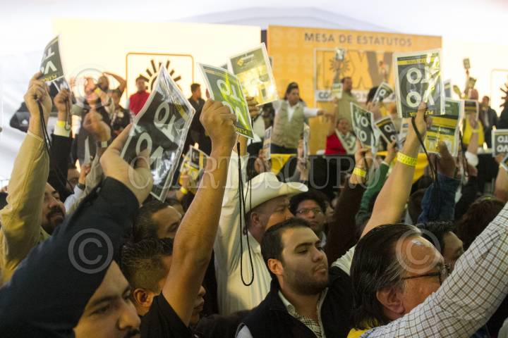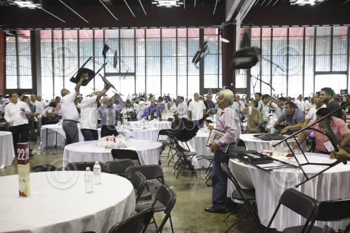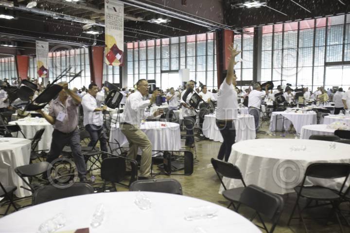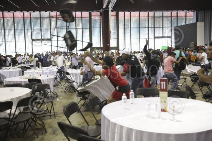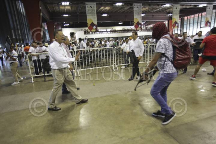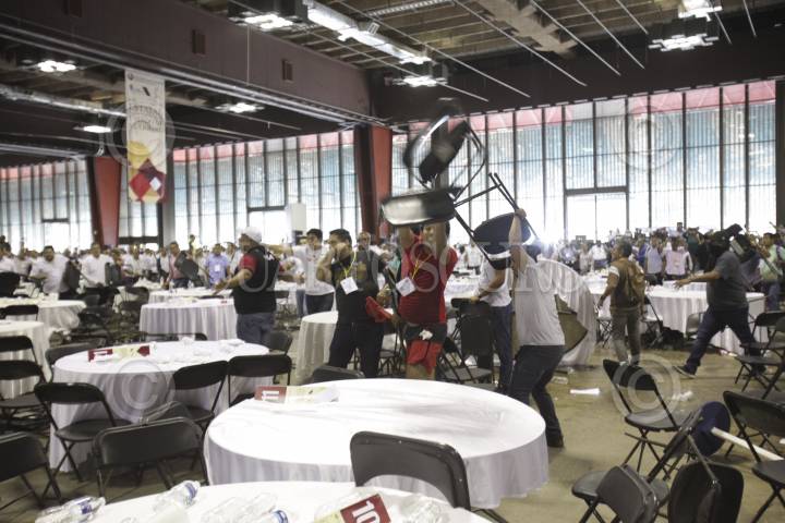CIUDAD DE MÉXICO, 18NOVIEMBRE2018.- El Consejo Nacional del Partido de Revolución Democrática avaló en lo general la disolución de la actual dirigencia y la eliminación de las corrientes internas, en su lugar habrá una Dirección Nacional Extraordinaria, conformada por cinco integrantes, esto último provocó el desacuerdo de varios de los consejeros ahí presentes que alegaron que no dieron pie al debate de estas resoluciones y fue por imposición, por momentos ambos bandos intercambiaron sillazos, botellazos e insultos, Camerino Márquez quien leyó el resolutivo llamó al orden y tras minutos tensos mando a receso en lo que se calmaban los ánimos. FOTO: MOISÉS PABLO /CUARTOSCURO.COM