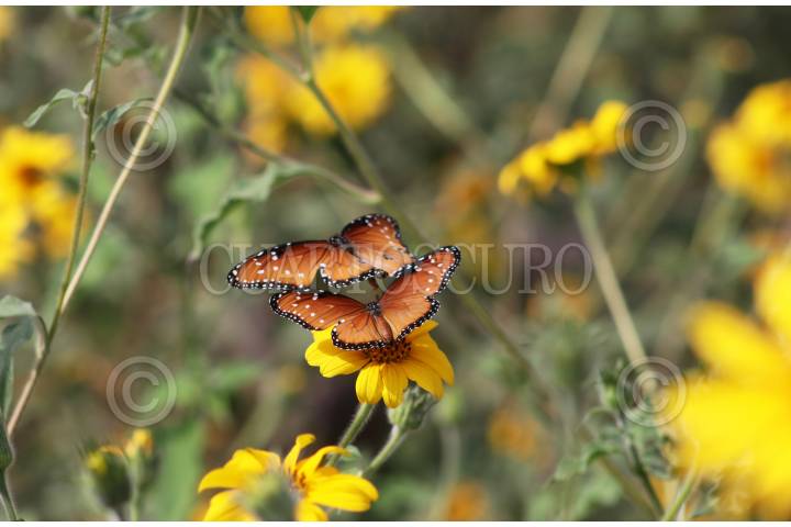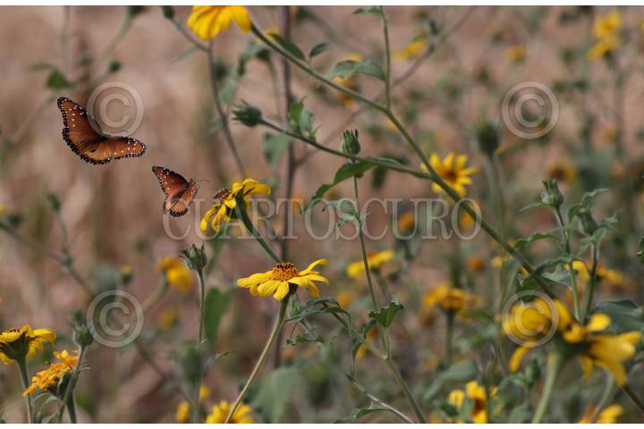 Un par de mariposas reina juegan entre flores de girasol silvestre.