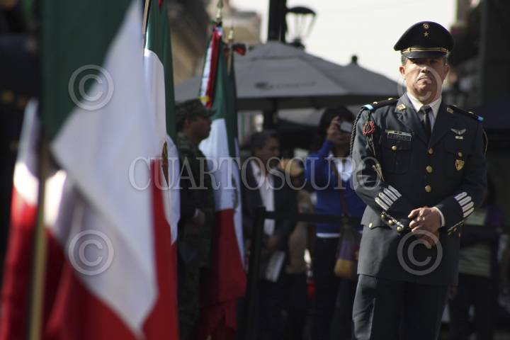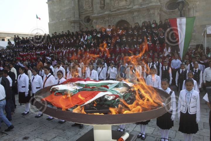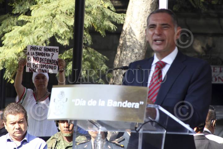 OAXACA, OAXACA, 24FEBRERO2014.- Este lunes se llevó a cabo la ceremonia por el Día de la Bandera, motivo por el cual se desarrolló en el zócalo de la ciudad la ceremonia de incineración de banderas, en el que instituciones educativas, así como de gobierno y castrenses incineraron sus lábaros patrios y estos les fueron repuestos, el acto fue encabezado por el gobernador Gabino Cué. Durante el desarrollo del mismo, una señora mostró una pancarta a modo de protesta por la reforma energética y la entrega de los recursos naturales a empresas extranjeras. FOTO: ARTURO PÉREZ ALFONSO /CUARTOSCURO.COM