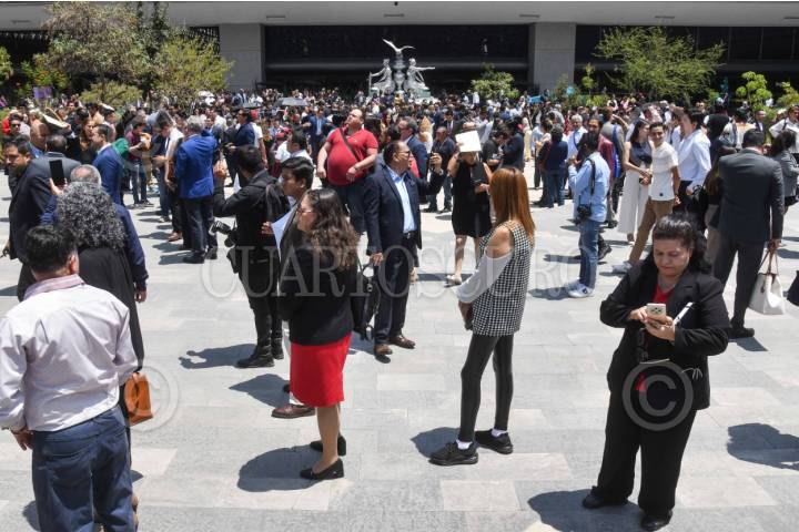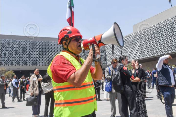 CIUDAD DE MÉXICO, 29ABRIL2025.- Decenas de trabajadores y diputados del recinto legislativo de San Lázaro fueron desalojados de sus puestos de trabajo por elementos de protección civil como parte del primer Simulacro Nacional del año. FOTO: MARIO JASSO/CUARTOSCURO.COM