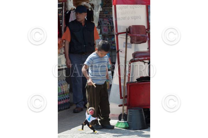MÉXICO, D.F., 05FEBRERO2015.- Un niño que atiende un puesto de refresco y botanas afuera del metro Hidalgo se divierte con títere, un juguete en desuso. FOTO: MOISÉS PABLO /CUARTOSCURO.COM