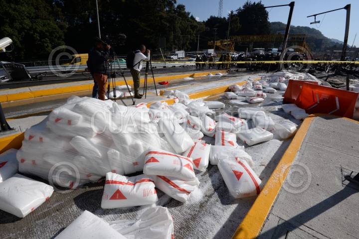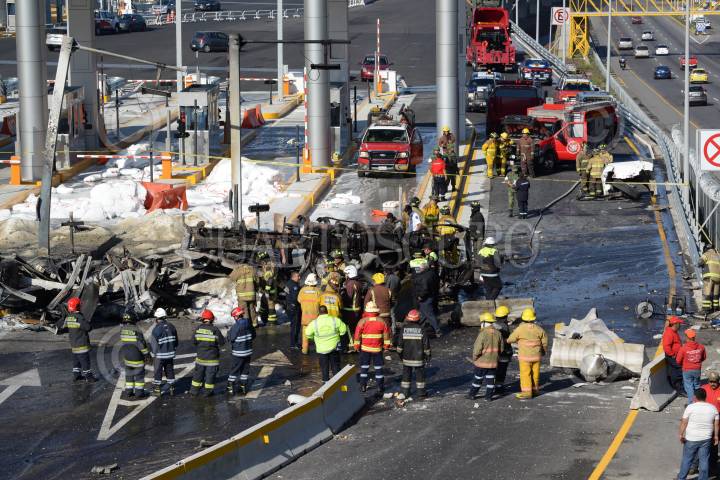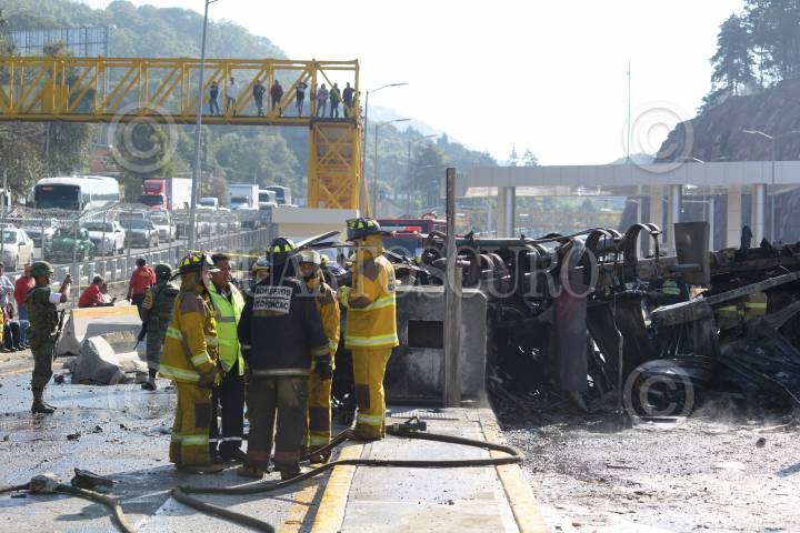 OCOYOACAC, ESTADO DE MÉXICO, 19ABRIL2017.- Un trailer que presuntamente se quedó sin frenos, volcó y después se incendió en la caseta de la autopista La Marquesa-Toluca, en Río Hondito. Bomberos de Ocoyoacac y la Ciudad de México en coordinación son la Policia Federal acordonaron el lugar. FOTO: ARTEMIO GUERRA BAZ /CURTOSCURO.COM